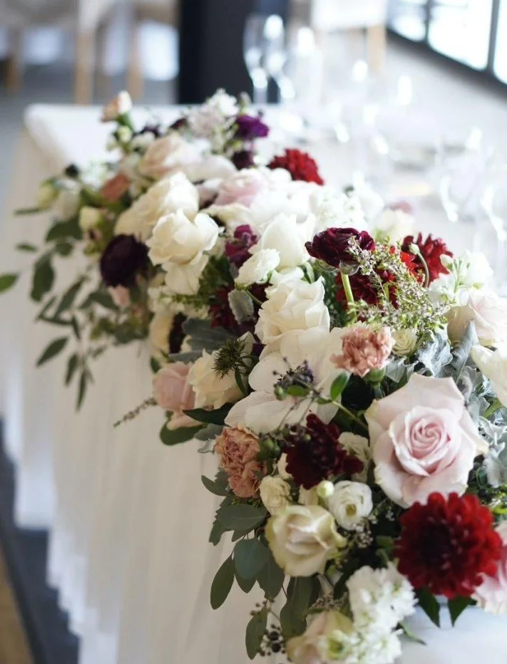 Head Table - Floral tray in front of couple with florals sweeping down towards the floor a bit; repurpose bouquets on wing tables in front of rest of wedding party