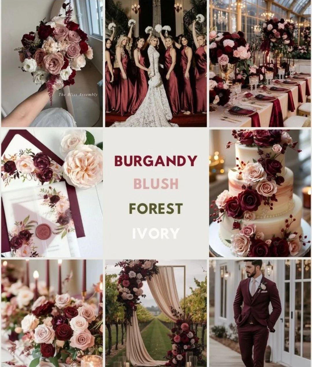 Florals to be customized through collaborative process, but preliminarily blooms to include ivories, blush, dusty roses, mauves, and burgundies (like hydrangeas and roses) with sage & dark greens