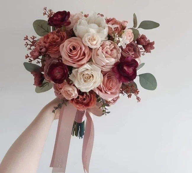 Florals to be customized through collaborative process, but preliminarily blooms to include ivories, blush, dusty roses, mauves, and burgundies with sage & dark greens
