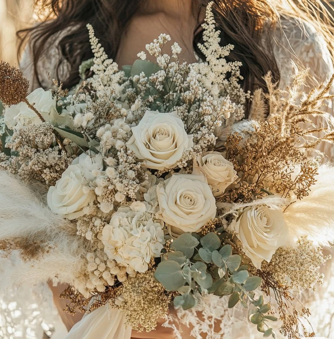 Florals to be customized through collaborative process, but preliminarily blooms to include ivory and tan blooms with sage greens