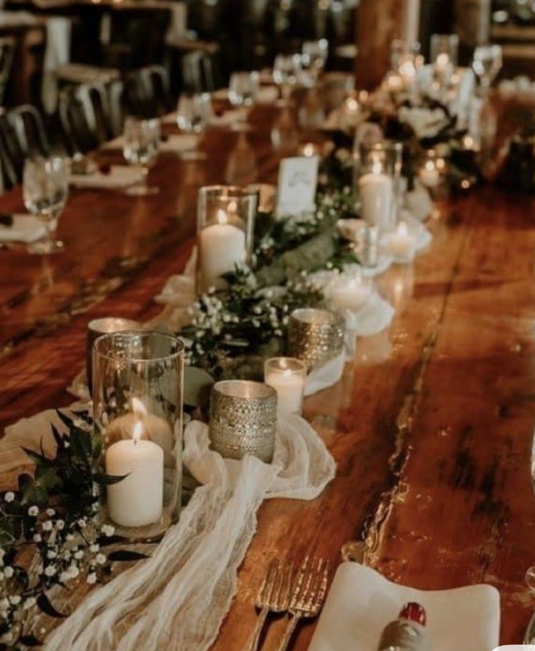 15 Guest Tables - eucalyptus and babies breath down middle of banquet tables